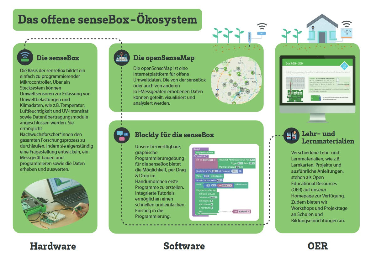 Die senseBox ist mehr als ein Mikrocontroller – sie ist der Einstieg in die Welt der Umweltforschung, Sensorik, Programmierung und Datenanalyse. Entwickelt für Bildung, Citizen Science und kreative Projekte, ermöglicht sie das einfache Erfassen und Teilen von Umweltdaten wie Temperatur, Feinstaub, UV-Strahlung und vieles mehr. Dank des modularen Aufbaus und der intuitiven Programmierung ist sie ideal für Schulen, Maker und alle, die ihre Umwelt besser verstehen wollen. Entwickelt im Rahmen eines Forschungsprojekts am Institut für Geoinformatik der Universität Münster, vereint sie wissenschaftliche Präzision mit praxisnaher Anwendung.